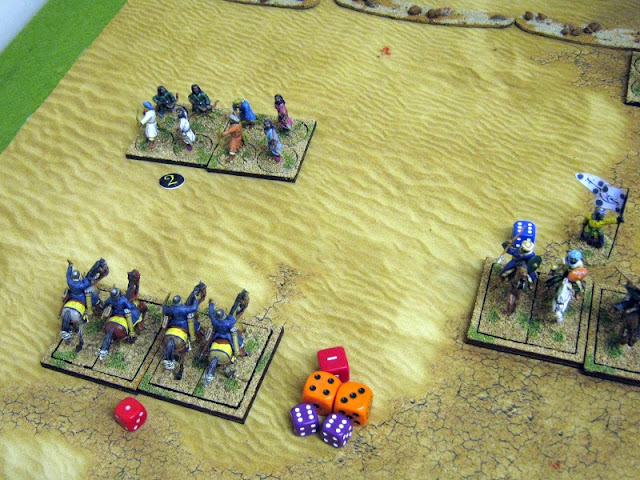 Early in turn 2 the Turcoples follow this up with another success, knocking out a unit of Egyptian Archers. Each time a unit is lost from an army they lose an activation dice, so the northern Egyptian army is already down from 8 to 6 activation dice.
